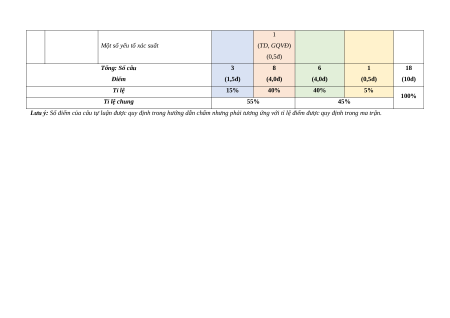 Lưu ý: Số điểm của câu tự luận được quy định trong hướng dẫn chấm nhưng phải tương ứng với tỉ lệ điểm được quy định trong ma trận.