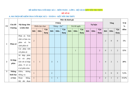 A. MA TRẬN ĐỀ KIỂM TRA CUỐI HỌC KÌ 2 – TOÁN 6 – KẾT NỐI TRI THỨC Mức độ đánh giá TNKQ Tổng Tỉ lệ