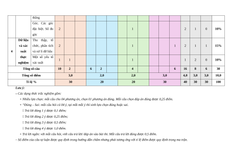 Dữ liệu Thu thập, tổ và xác chức, phân tích 2 1 1 2 1 1 15% 4 suất và xử lí dữ liệu thực Một số yếu tố 1 1 1 1 2 0 10% nghiệm xác suất Tổng số câu 10 2 6 2 4 6 16 8 6 30 Tổng số điểm 3,0 2,0 2,0 3,0 4,0 3,0 3,0 10,0 Tỉ lệ % 30 20 20 30 40 30 30 100 Lưu ý: