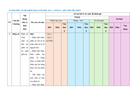 Chủ đề/ Nội dung/ đơn Tự luận TT Nhiều lựa chọn “Đúng – Sai” Trả lời ngắn % Chương vị kiến thức Vận Vận Vận Vận Vận điểm Biết Hiểu Biết Hiểu Biết Hiểu Biết Hiểu Biết Hiểu dụng dụng dụng dụng dụng Phân số. Tính chất cơ bản của 2 2 0 0 5% phân số. So 1