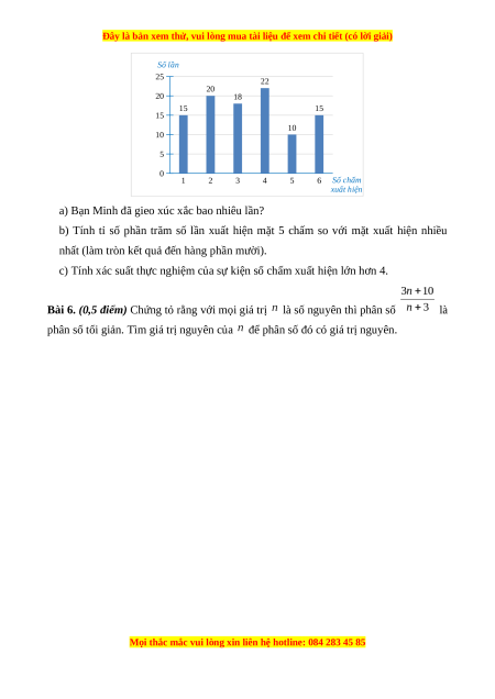 Bài 5. (1,5 điểm) Minh gieo một con xúc xắc có sáu mặt một số lần và ghi lại số