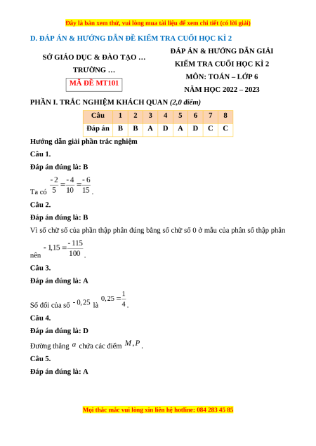 ĐỀ KIỂM TRA CUỐI HỌC KÌ 2 MÔN: TOÁN – LỚP 6