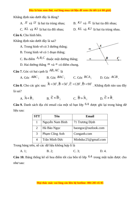 Khẳng định nào dưới đây là đúng? A. và là hai tia trùng nhau; B. và là hai tia đối nhau; C. và là hai tia đối nhau; D. và là hai tia trùng nhau. Câu 6. Cho hình bên.