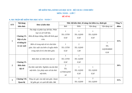 ĐỀ KIỂM TRA, ĐÁNH GIÁ HỌC KÌ II – BỘ SÁCH: CÁNH DIỀU MÔN: TOÁN − LỚP 7 ĐỀ SỐ 02