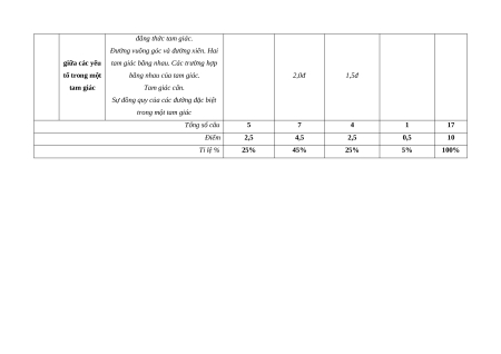 Sự đồng quy của các đường đặc biệt trong một tam giác Tổng số câu 5 7 4 1 17 Điểm 2,5 4,5 2,5 0,5 10 Tỉ lệ % 25% 45% 25% 5% 100%