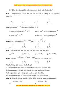 Câu 4. Tung một đồng xu cân đối. Xác suất của biến cố “Đồng xu xuất hiện mặt ngửa” là A. ; B. ; C. ; D. . Câu 5. Biểu thức