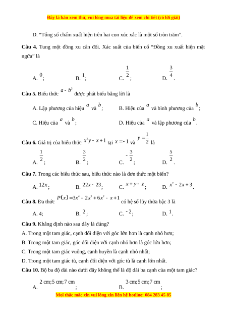 Câu 7. Trong các biểu thức sau, biểu thức nào là đơn thức một biến? A. ; B. ; C. ; D. . Câu 8. Đa thức