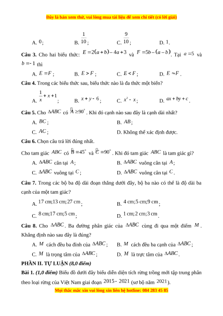 Câu 4. Trong các biểu thức sau, biểu thức nào là đa thức một biến? A. ; B. ; C. ; D. . Câu 5. Cho có
