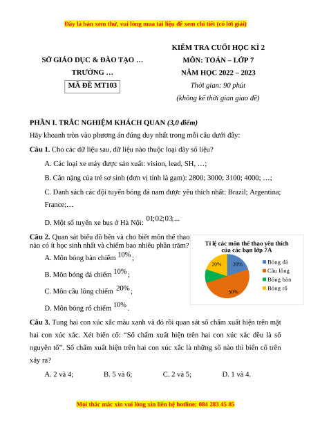 của các bạn lớp 7A A. Môn bóng bàn chiếm ; 20% 20% Bóng đá B. Môn bóng đá chiếm ; Cầu lông Bóng bàn C. Môn cầu lông chiếm ; Bóng rổ 50% D. Môn bóng rổ chiếm .