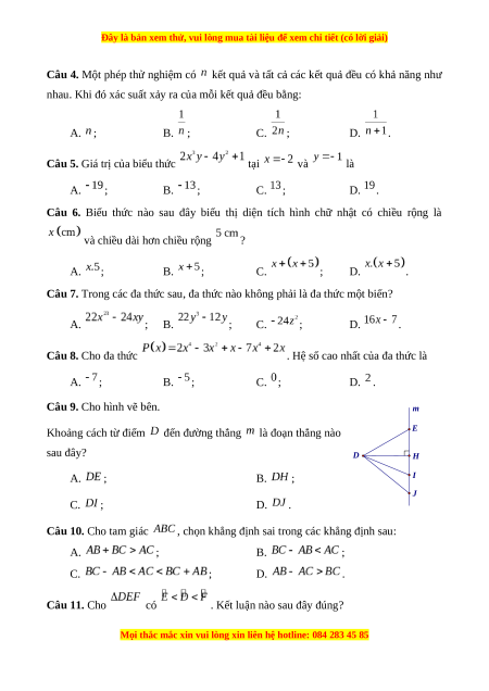Khoảng cách từ điểm đến đường thẳng là đoạn thẳng nào E sau đây? D H A. ; B. ; I J C. ; D. . Câu 10. Cho tam giác
