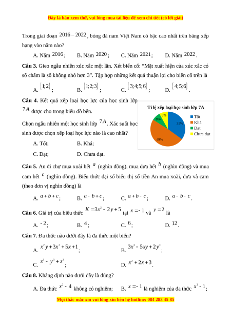 Câu 7. Đa thức nào dưới đây là đa thức một biến? A. ; B. ; C. ; D. .