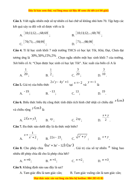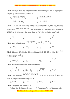 Câu 7. Đa thức nào dưới đây là đa thức một biến? A. ; B. ; C. ; D. . Câu 8. Cho phép chia