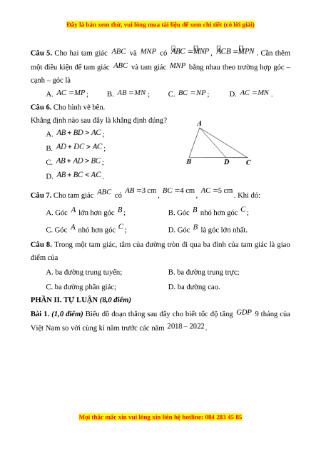 Khẳng định nào sau đây là khẳng định đúng? A. ; B. ; C. ; D. . Câu 7. Cho tam giác có , , . Khi đó: A. Góc lớn hơn góc ; B. Góc nhỏ hơn góc ; C. Góc nhỏ hơn góc ; D. Góc là góc lớn nhất.