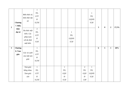 lượng tỉ Đại lượng tỉ TD, TD, lệ lệ thuận. GTT GQVĐ Đại lượng tỉ H / lệ nghịch. 0,25đ MHH 0,5đ 1 TD, 1 Biểu thức số, GTT TD, biểu thức đại H GQVĐ số. Chương 0,25đ 0,5đ 7. Biểu 2 3 0 2 17,5% thức 2 Đa thức một đại số TD, 1 biến. Các GTT TD, phép toán H GQVĐ với đa thức 0,5đ 0,5đ một biến. 3 Chương 1 6 5 1 40% 8. Tam TD, Góc và cạnh giác GTT của một tam H giác 0,25đ Tam giác 1 1 2 1 bằng nhau. TD, TD, TD, TD, Tam giác GTT GQV GQV GQVĐ cân H Đ Đ 0,5đ 0,25đ 0,5đ 1,0đ Đường vuông góc và đường xiên. Đường trung trực của tam 2 2 2 giác. Tính TD, TD, TD, chất ba GTT GTT GQVĐ đường trung H H 0,5đ trực, đường 0,5đ 0,5đ trung tuyến, đường cai, đường phân giác của tam giác Làm quen 3 2 Chương với biến cố 2 1 TD, TD, 1 1 9. Một ngẫu nhiên. TD, TD, GTT GTT TD, TD, 4 số yếu Làm quen GQVĐ GQV 5 3 2 32,5% H H GQVĐ GQVĐ tố xác với xác suất 0,5đ Đ 0,75đ 0,5đ 0,5đ 0,5đ suất của biến cố 0,5đ ngẫu nhiên. Tổng số câu 12 4 4 0 1 3 0 3 3 16 8 6 30 Tổng số điểm 3,0 2,0 2,0 3,0 4,0 3,0 3,0 10 Tỉ lệ % 30% 20% 20% 30% 40% 30% 30% 100% Lưu ý: