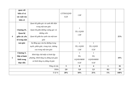 và hình lăng trụ đứng tứ giác thực tiễn 0,5đ 0,5đ Tổng số câu 3 8 4 1 16 Điểm 2,0 5,0 2,5 0,5 10 Tỉ lệ % 20% 50% 25% 5% 100%