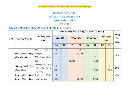 - Tailieugiaovien.com.vn giới thiệu bộ 10 đề cuối kì 2 gồm đầy đủ ma trận và lời giải chi tiết môn Toán 8 Cánh diều mới nhất năm 2024 nhằm giúp Giáo viên có thêm tài liệu tham khảo ra đề thi Toán lớp 8.