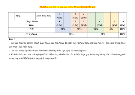 Tổng: Số câu 4 2 5 4 1 16 Điểm (2,0đ) (1,0đ) (3,5đ) (2,5đ) (0,5đ) (10đ) Tỉ lệ 20% 50% 25% 5% 100% Tỉ lệ chung 70% 30% 100% Lưu ý: