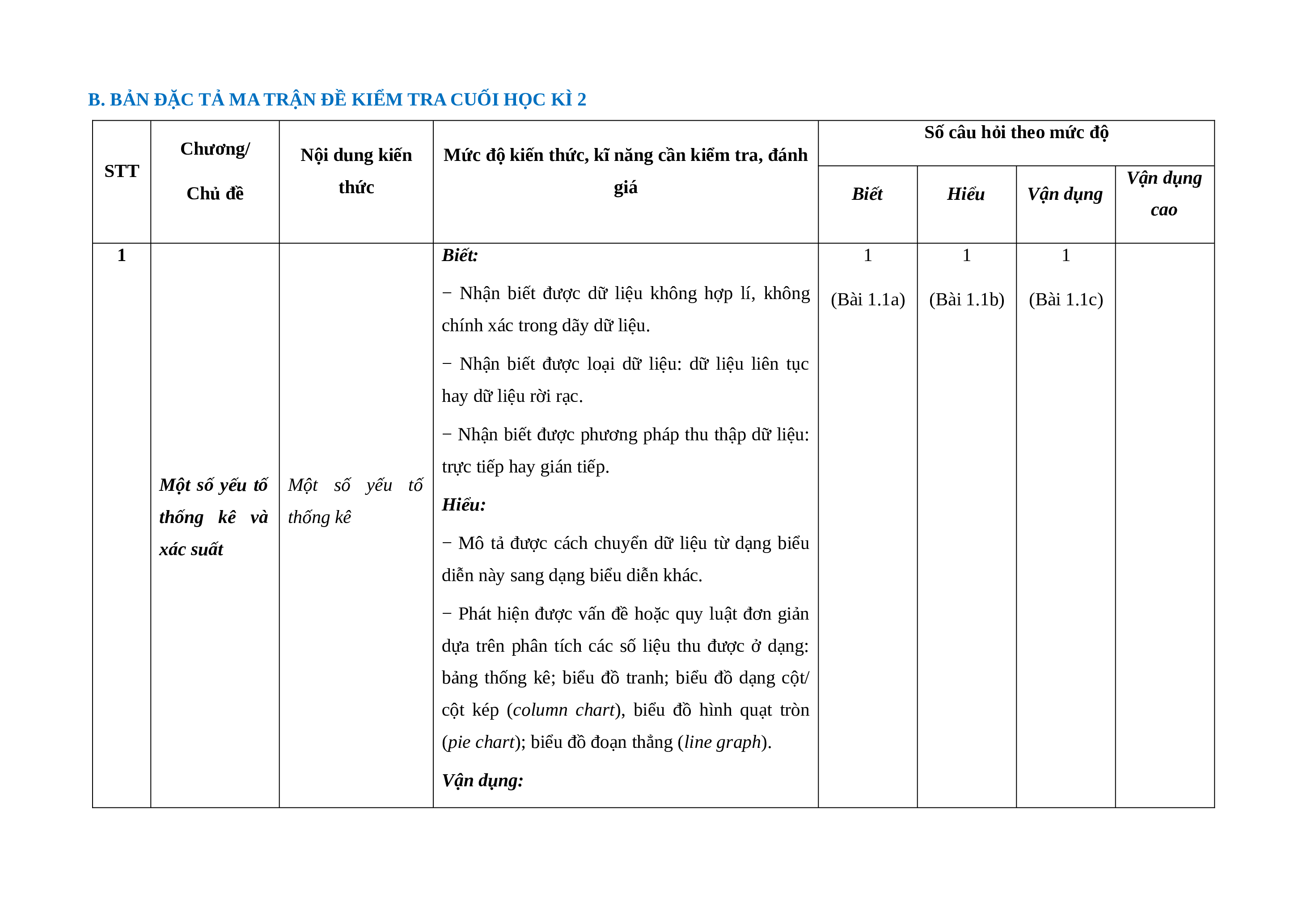 B. BẢN ĐẶC TẢ MA TRẬN ĐỀ KIỂM TRA CUỐI HỌC KÌ 2