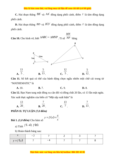 Câu 10. Cho hình vẽ, biết . Tỉ số bằng M B 12cm 5cm N C A P A. . B. . C. . D. .