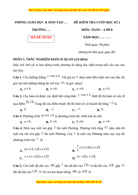 ĐỀ KIỂM TRA CUỐI HỌC KÌ 2 TRƯỜNG … MÔN: TOÁN – LỚP 8 MÃ ĐỀ MT201 NĂM HỌC: … – … Thời gian: 90 phút