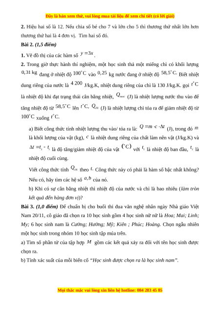 2. Trong giờ thực hành thí nghiệm, một học sinh thả một miếng chì có khối lượng đang ở nhiệt độ vào