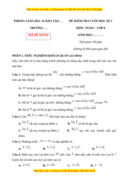 ĐỀ KIỂM TRA CUỐI HỌC KÌ 2 TRƯỜNG … MÔN: TOÁN – LỚP 8 MÃ ĐỀ MT202 NĂM HỌC: … – … Thời gian: 90 phút