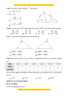 Câu 8. Phúc gieo một con xúc xắc 50 lần và thống kê lại kết quả các lần gieo ở bảng sau: Mặt 1 chấm 2 chấm 3 chấm 4 chấm 5 chấm 6 chấm Số lần 8 9 9 5 6 13 xuất hiện
