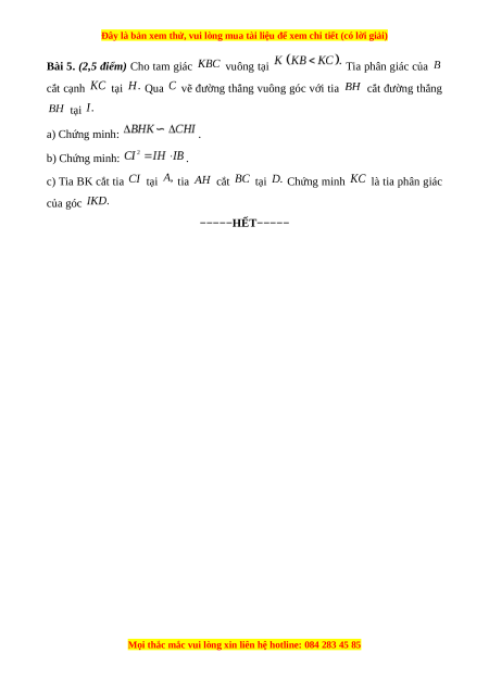 Bài 5. (2,5 điểm) Cho tam giác vuông tại Tia phân giác của cắt cạnh tại