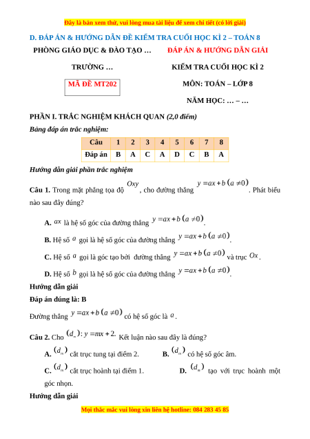 D. Hệ số gọi là hệ số góc của đường thẳng . Câu 2. Cho