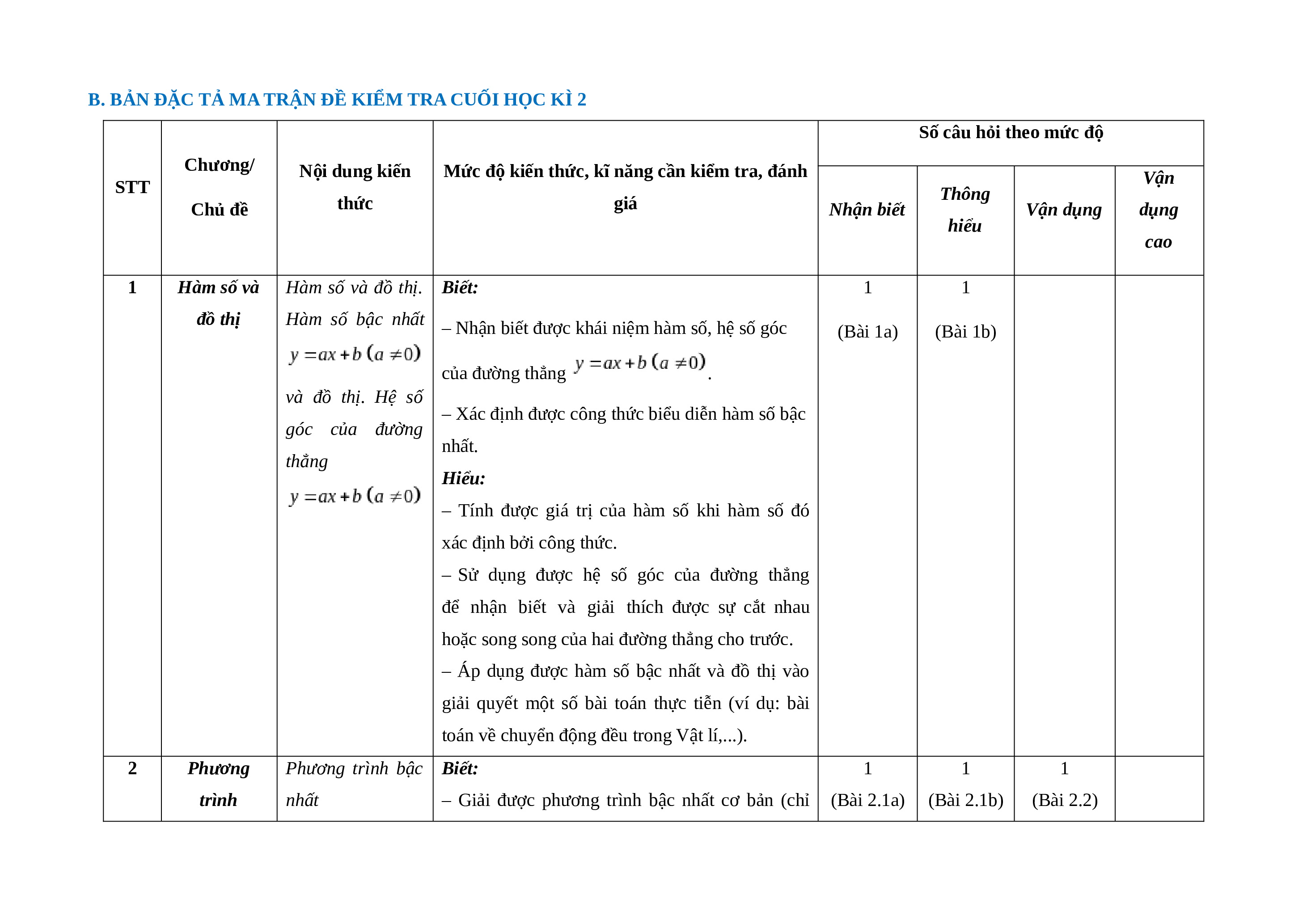 B. BẢN ĐẶC TẢ MA TRẬN ĐỀ KIỂM TRA CUỐI HỌC KÌ 2