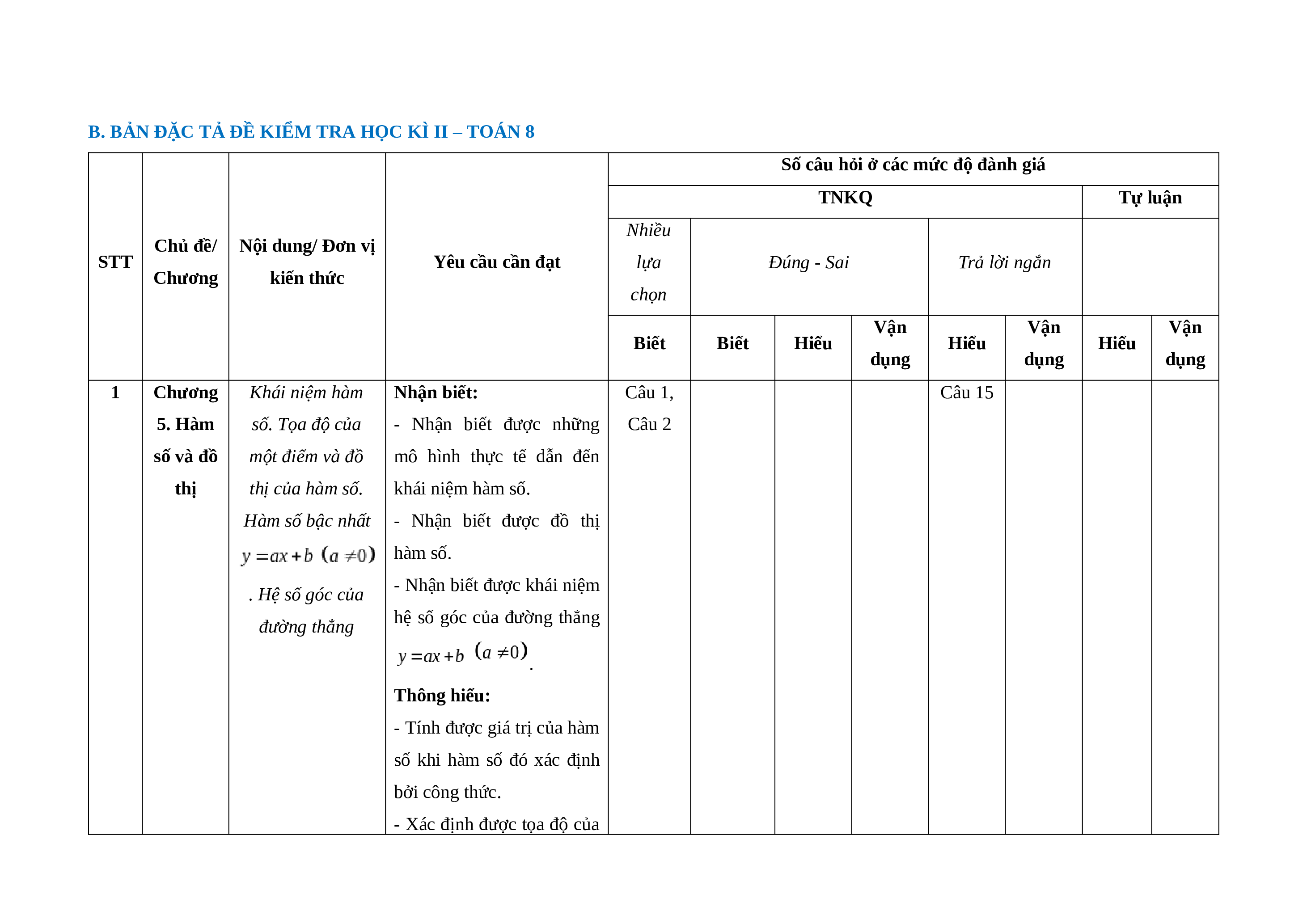 B. BẢN ĐẶC TẢ ĐỀ KIỂM TRA HỌC KÌ II – TOÁN 8