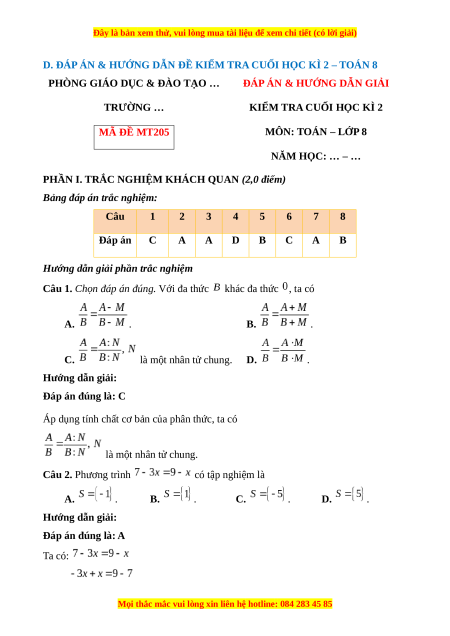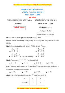 ĐỀ KIỂM TRA CUỐI HỌC KÌ 2 TRƯỜNG … MÔN: TOÁN – LỚP 8 MÃ ĐỀ MT205 NĂM HỌC: … – … Thời gian: 90 phút