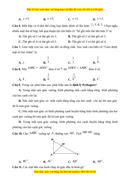 phương của hai cạnh góc vuông. Câu 10. Cho vuông tại , đường cao . Tích bằng B H C A A. . B. . C. . D. .