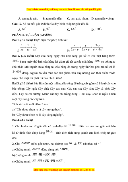 Câu 12. Số đo mỗi góc ở đỉnh của đáy hình chóp tứ giác đều là A. B. C. D.