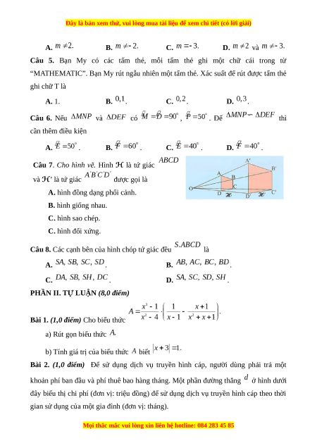 “MATHEMATIC”. Bạn My rút ngẫu nhiên một tấm thẻ. Xác suất để rút được tấm thẻ ghi chữ T là A. 1. B. . C. . D. . Câu 6. Nếu và có , . Để thì cần thêm điều kiện A. . B. . C. . D. .