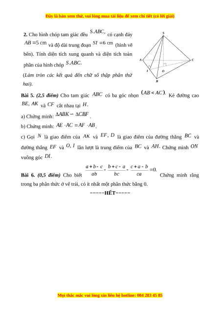 2. Cho hình chóp tam giác đều có cạnh đáy S và độ dài trung đoạn (hình vẽ