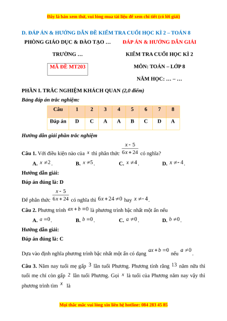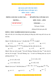 ĐỀ KIỂM TRA CUỐI HỌC KÌ 2 TRƯỜNG … MÔN: TOÁN – LỚP 8 MÃ ĐỀ MT203 NĂM HỌC: … – … Thời gian: 90 phút