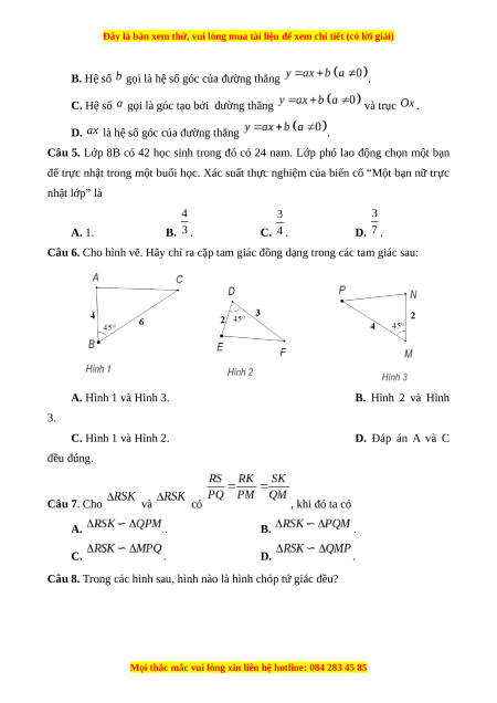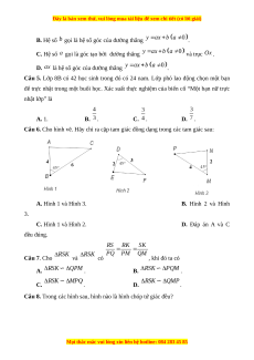 Câu 6. Cho hình vẽ. Hãy chỉ ra cặp tam giác đồng dạng trong các tam giác sau: A. Hình 1 và Hình 3. B. Hình 2 và Hình 3. C. Hình 1 và Hình 2. D. Đáp án A và C đều đúng. Câu 7. Cho và có , khi đó ta có A. . B. . C. . D. .