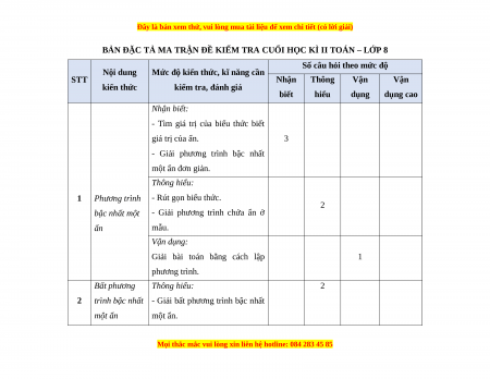 BẢN ĐẶC TẢ MA TRẬN ĐỀ KIỂM TRA CUỐI HỌC KÌ II TOÁN – LỚP 8