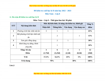 Đề kiểm tra cuối học kì II năm học 2022 – 2023 Môn Toán – Lớp 8