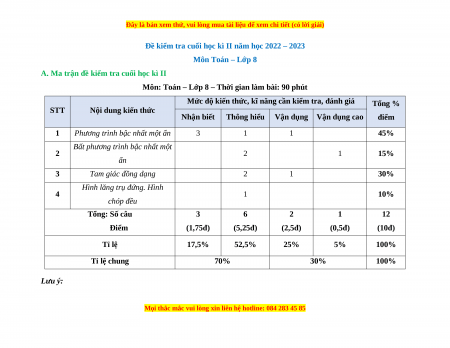 Đề thi cuối kì 2 Toán 8 năm 2022-2023 - Đề 8