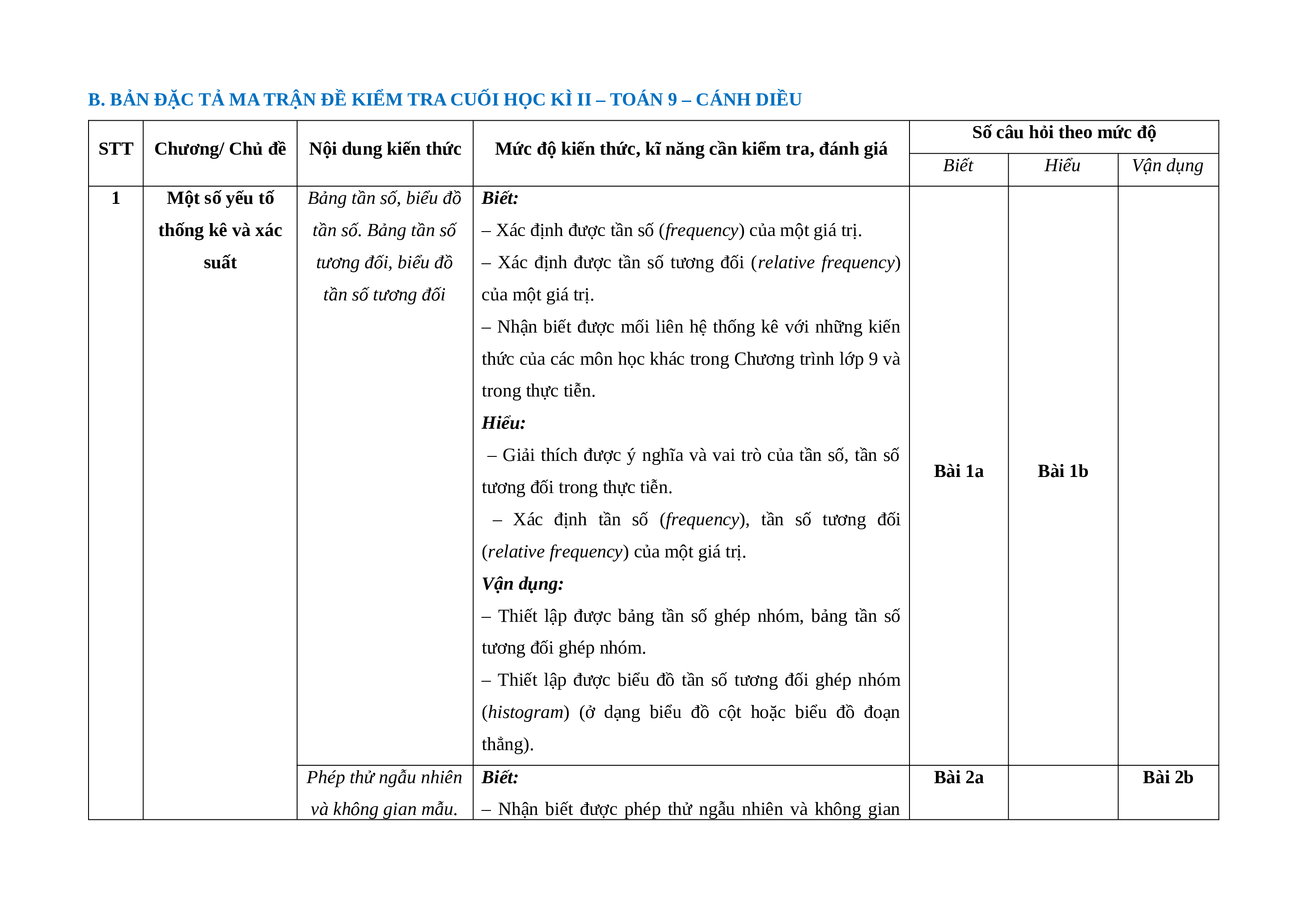 B. BẢN ĐẶC TẢ MA TRẬN ĐỀ KIỂM TRA CUỐI HỌC KÌ II – TOÁN 9 – CÁNH DIỀU