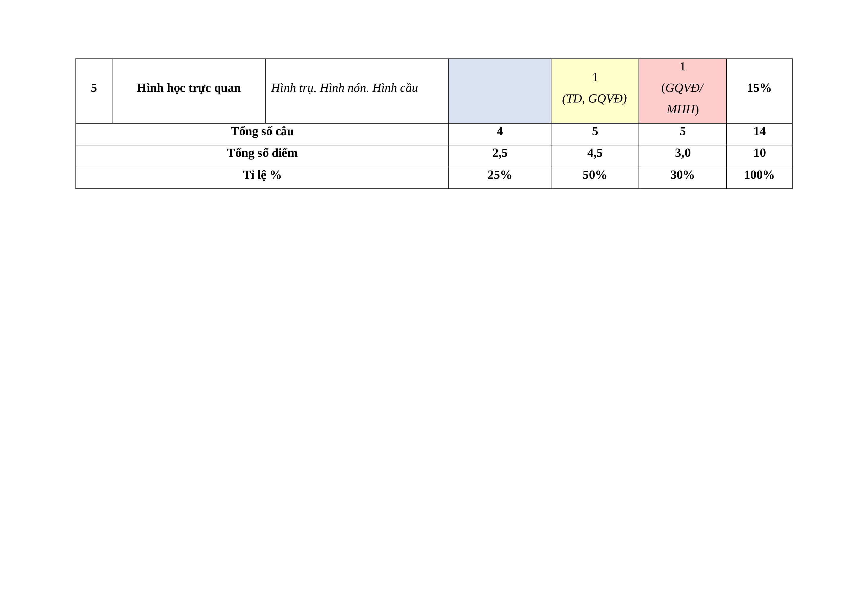 Hình trụ. Hình nón. Hình cầu (GQVĐ/ 15% (TD, GQVĐ) MHH) Tổng số câu 4 5 5 14 Tổng số điểm 2,5 4,5 3,0 10 Tỉ lệ % 25% 50% 30% 100%