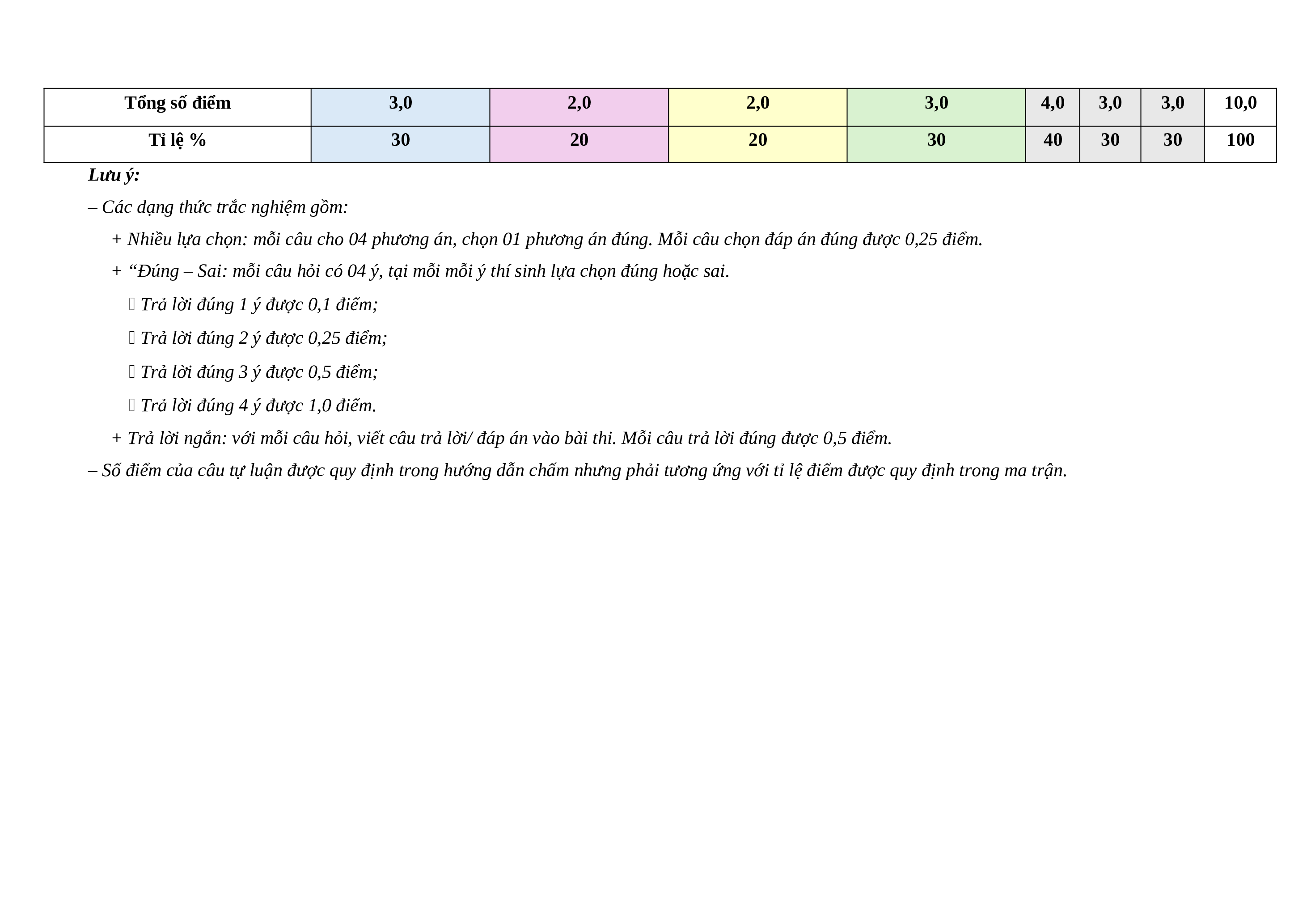 – Số điểm của câu tự luận được quy định trong hướng dẫn chấm nhưng phải tương ứng với tỉ lệ điểm được quy định trong ma trận.