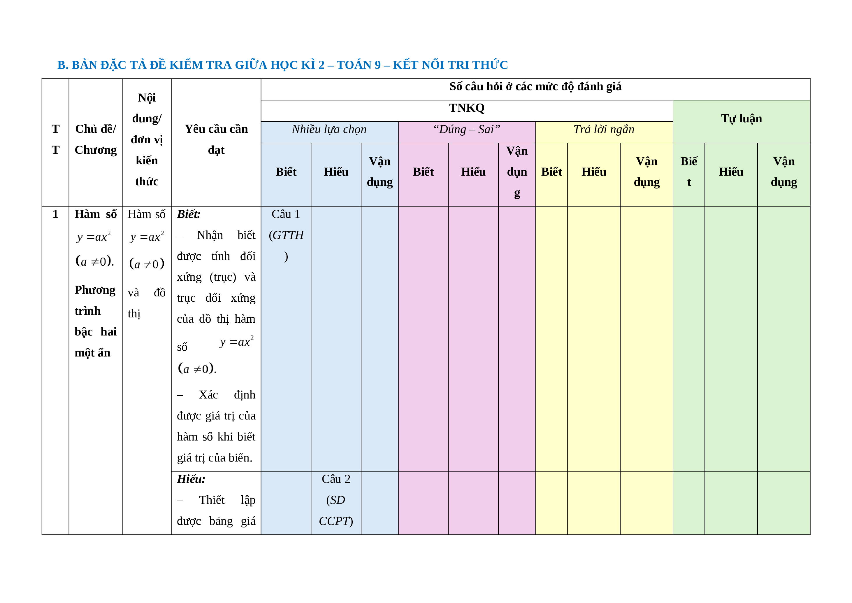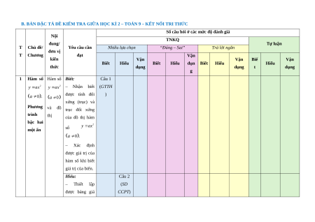 B. BẢN ĐẶC TẢ ĐỀ KIỂM TRA GIỮA HỌC KÌ 2 – TOÁN 9 – KẾT NỐI TRI THỨC