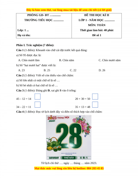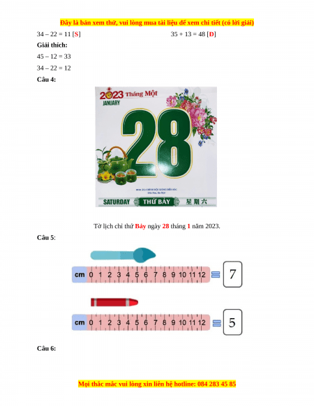 Tờ lịch chỉ thứ Bảy ngày 28 tháng 1 năm 2023. Câu 5: Câu 6: