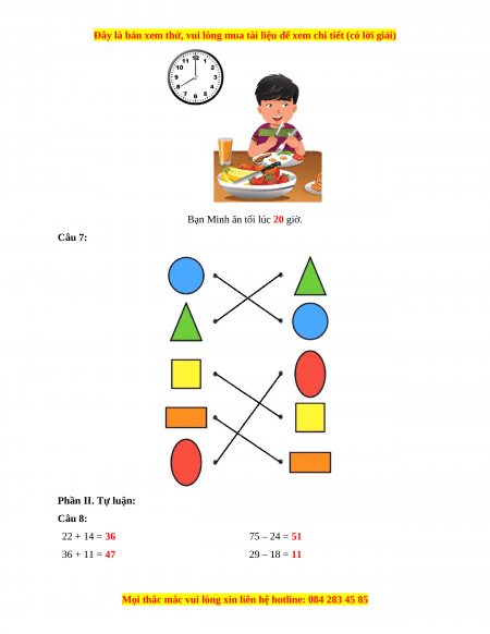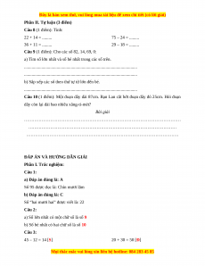 Câu 8 (1 điểm): Tính: 22 + 14 = ......... 75 – 24 = ......... 36 + 11 = ......... 29 – 18 = .........