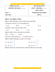 LỚP 1 - NĂM HỌC .............. MÔN: TOÁN Lớp: 1 ...
