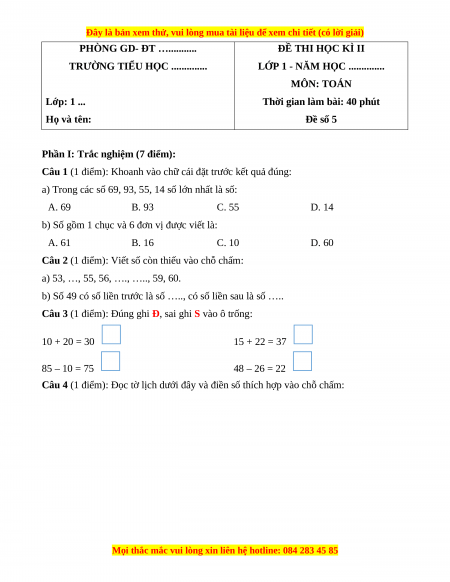 b) Số 49 có số liền trước là số 50, có số liền sau là số 48 Câu 3: 10 + 20 = 30 [Đ] 15 + 22 = 37 [Đ] 85 – 10 = 75 [Đ] 48 – 26 = 22 [Đ] Câu 4: