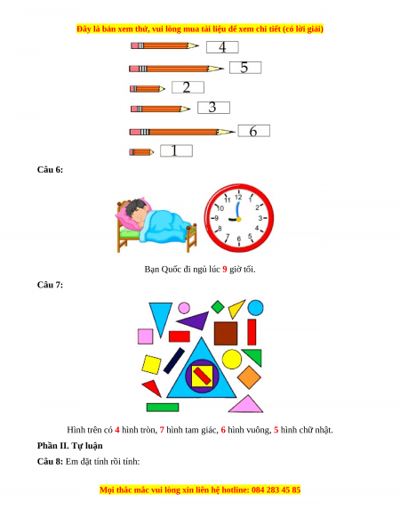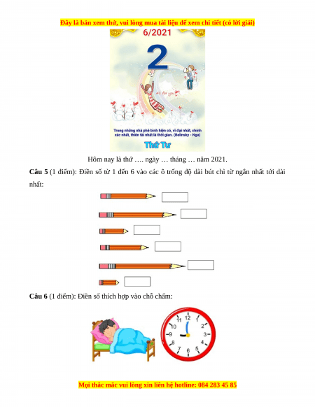 Câu 5(1 điểm): Điền số từ 1 đến 6 vào các ô trống độ dài bút chì từ ngắn nhất tới dài